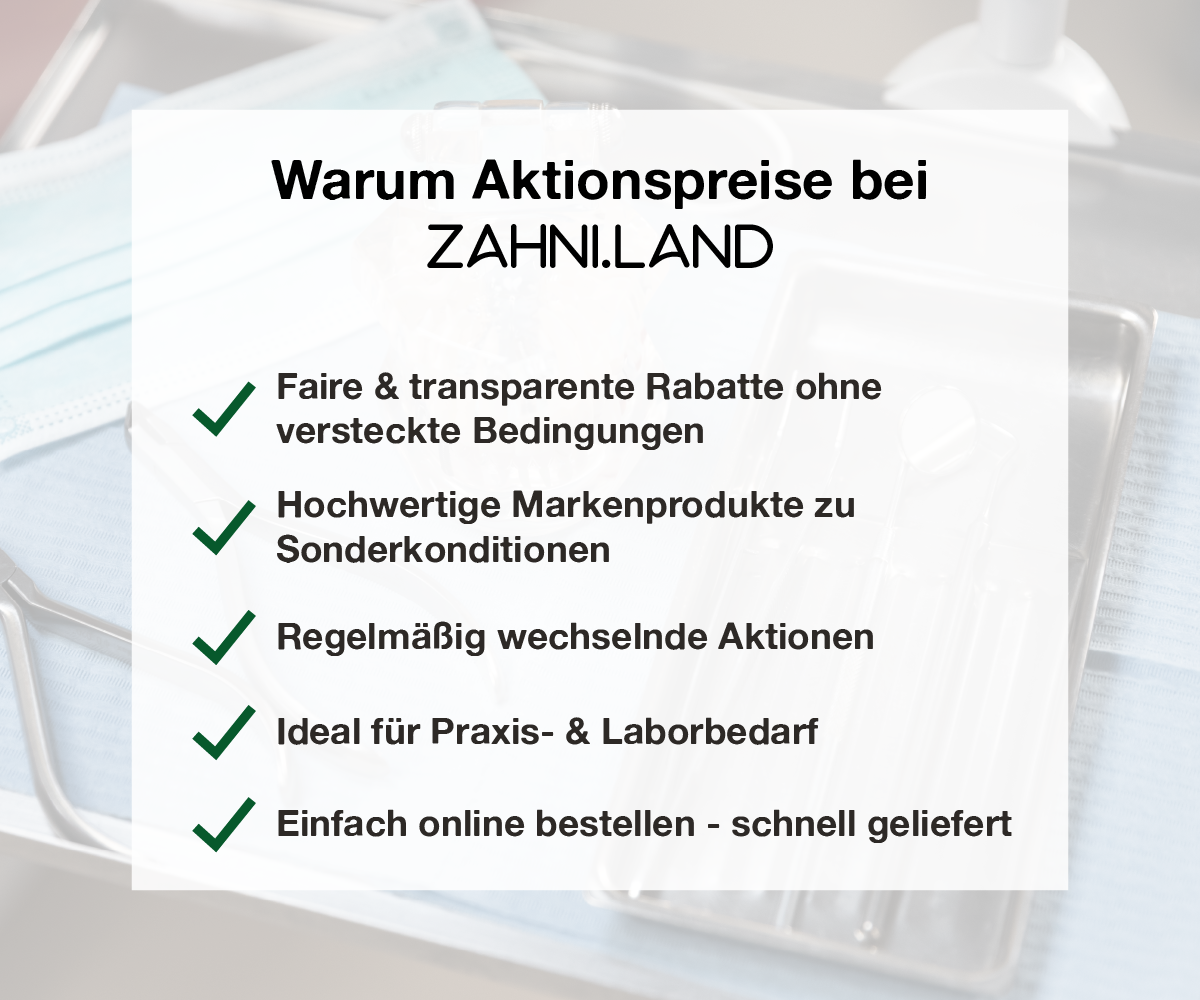 Bei zahni.land profitieren sie regelmäßig von attraktiven Aktionspreisen auf ausgewählte Dentalprodukte.