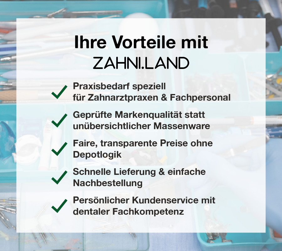 Bei zahni.land finden Zahnarztpraxen und medizinische Einrichtungen ein breites, praxisnahes Sortiment an Dentalmaterialien, das auf Qualität, Wirtschaftlichkeit und sofortige Einsatzbereitschaft ausgelegt ist.